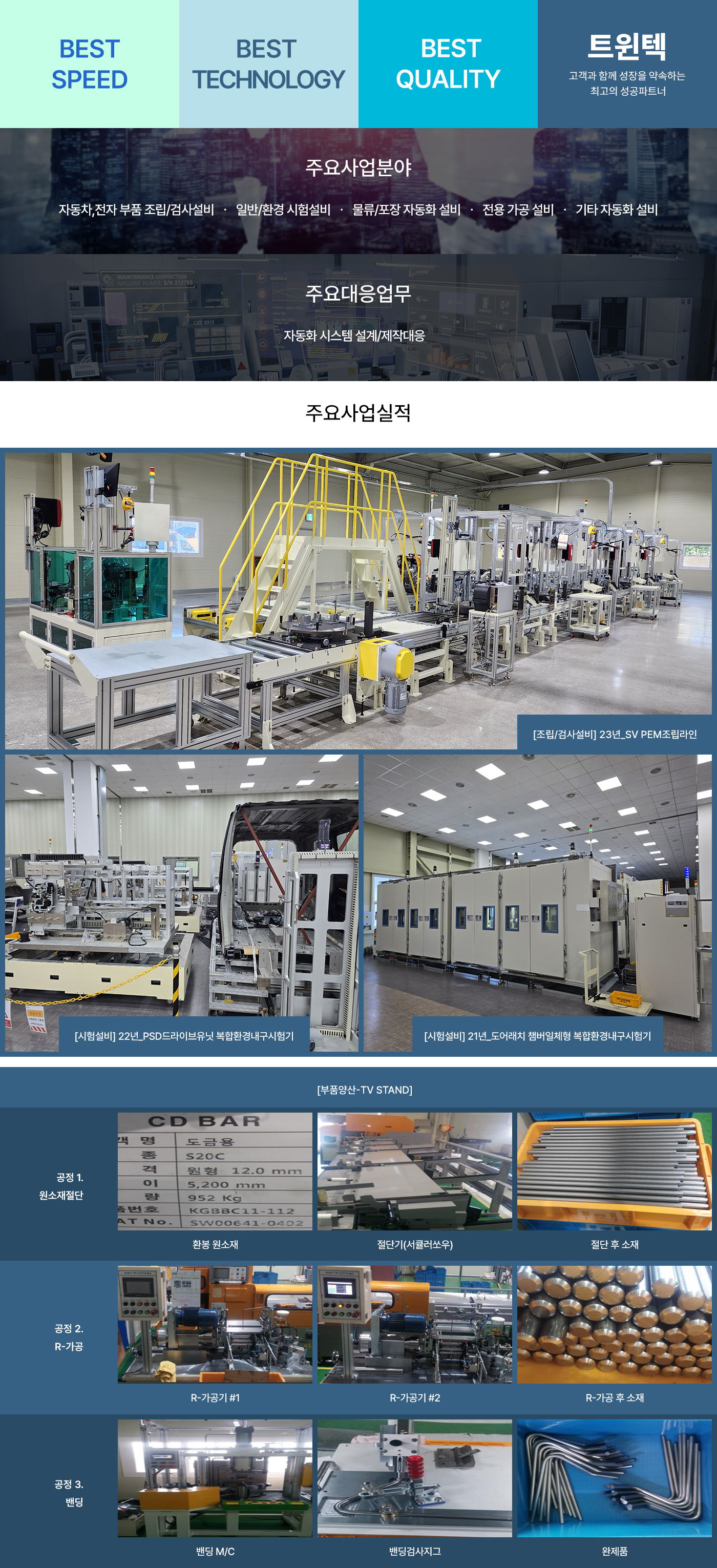 자동차, 전자 부품 조립/검사설비, 일반/환경 시험설비,물류/포장 자동화 설비, 전용 가공 설비, 기타 자동화 설비