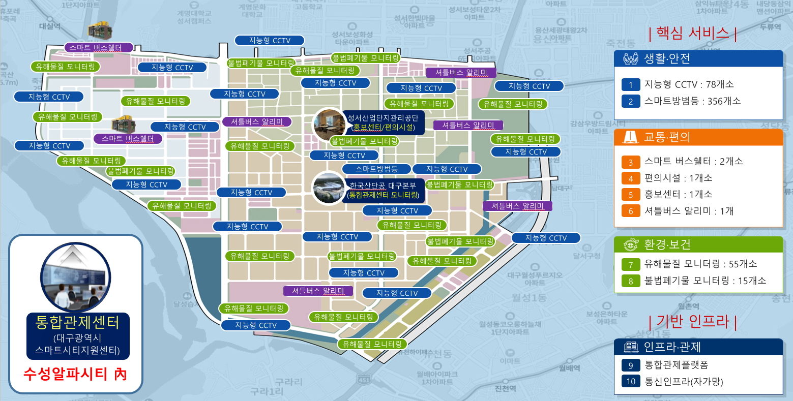 | 목 적 | 성서산업단지 내 기반시설의 스마트화로 편의 및 안정성 개선 등 다양한 서비스를 통한 산단 내 기업 및 근로자의 편의시설 제공 |